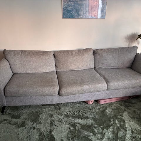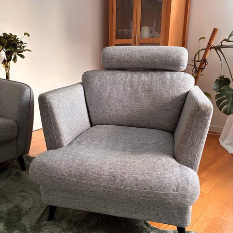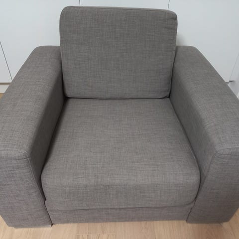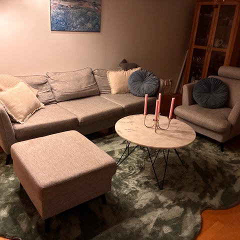 Soffa, fåtölje, nackstöd samt fotpall/puff. Det är i använt skick. Soffans botten sviktar något och det finns fläckar i tyget. Det är dock en ganska tacksam färg som döljer mycket.