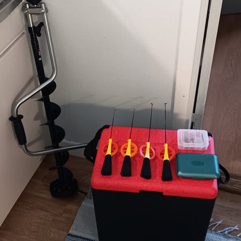 Manuella isborrar i flera färger. Borrarna har spiralformade skär och vevhandtag för handdriven borrning genom is. Passar för isfiske eller andra aktiviteter där hål behöver borras i is. Flera olika färger syns på bilden, bland annat blå, röd, grön och orange.