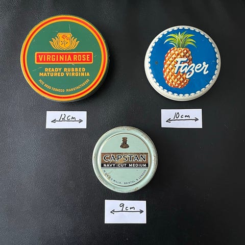 Samling plåtburkar från blandade varumärken i olika storlekar och former. Motiven är flerfärgade och inkluderar bland annat text- och bilddekorerade burkar för livsmedel som bakpulver, te och andra varor. Flera burkar har nostalgiska och dekorativa tryck med blommor, landskap och grafiska mönster. Passar som inredningsdetaljer, förvaring eller samlarobjekt. Samlingen består av både runda och fyrkantiga burkar i metall/plåt med lock.