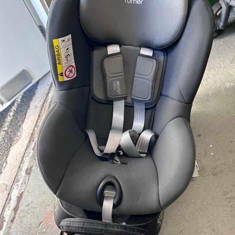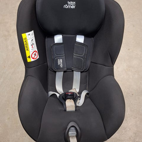 Britax Römer bilbarnstol i storlek 18. Bilbarnstolen är svart med inbyggd internsele och vadderade axel- och bröstkuddar. Stolen har tydliga markeringar och instruktioner på sidan för korrekt montering och användning. Passar för bakåtvänd montering enligt märkningen på stolen. Sitsen är formad med sidokrockskydd och stöd för barnets huvud och kropp. Klädseln är i textil och stolen har bärhandtag framtill för enklare hantering vid montering och flytt mellan bilar. Stolen är vändbar. Det medföljer en nyföddinsats som är oanvänd och gör att stolen med fördel kan användas från nyfödd. Isofix.