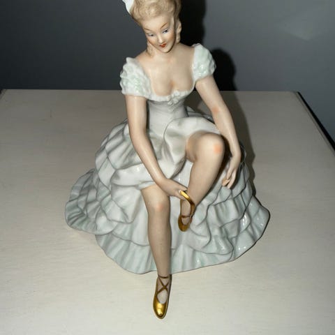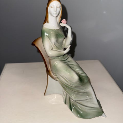 Figuren föreställer en elegant sittande dam i klänning, hållande spegel och puder. Fint utförande med mjuka färgövergångar och gulddetaljer. Klassisk efterkrigsdesign (ca 1940–1960-tal).