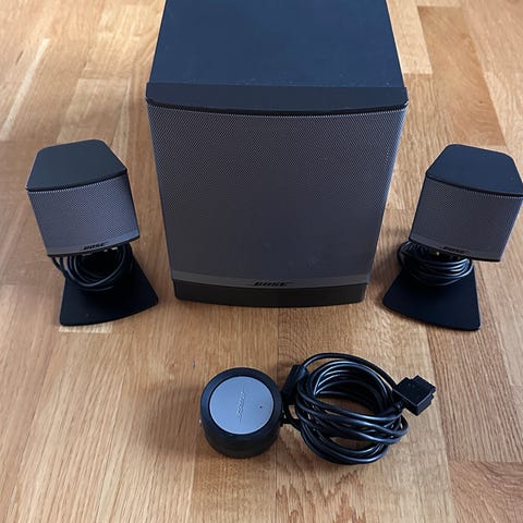 Bose Companion 2 Series II datorhögtalare i grått utförande. Systemet består av två fristående högtalare avsedda för användning med dator eller annan ljudkälla via analog anslutning. På framsidan finns volymkontroll och hörlursuttag. På baksidan finns ingång för ljudkälla samt anslutning mellan högtalarna och strömkabel. Passar för exempelvis stationär dator, laptop eller annan utrustning med motsvarande ljudutgång.