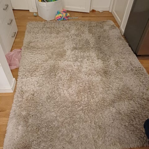 Mattan är beige och tillverkad i 100 % polyester. Lång lugg ger en mjuk och tjock struktur. Passar exempelvis i vardagsrum eller sovrum där en mjuk textilmatta önskas på golvet.