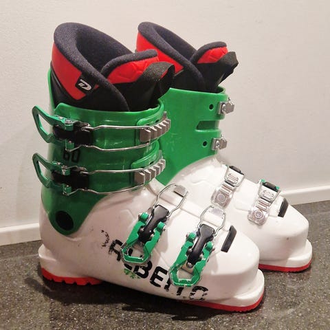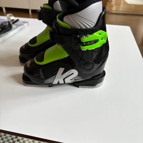 K2 pjäxor för barn i storlek 20,5 mondo. Pjäxorna är i svart och grön färg med justerbara spännen framtill och över vristen. Invändigt finns en vadderad innersko för komfort och stöd. Passar för alpin åkning för barn som behöver en stabil och lättanvänd pjäxa.