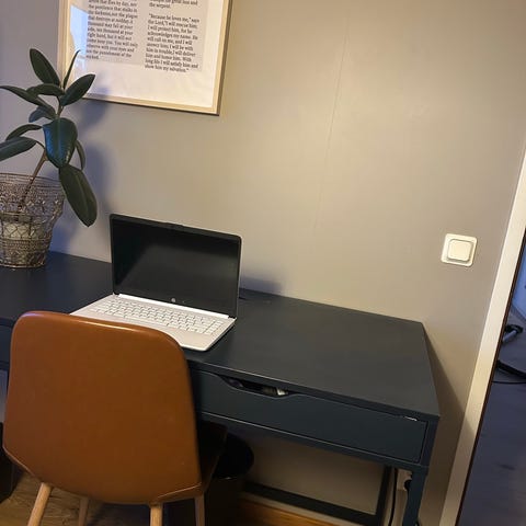 Skrivbord i mörkbrunt utförande med inbyggd förvaring i form av öppna fack framtill. Det är högre än ett vanligt bord och passar till en barstol (som jag också har till försäljning). Vill man ha bordet i vanlig höjd får man kapa benen en bit. Bordet är väggfäst och lämpar sig för mindre utrymmen som arbetsplats eller studiehörna eller hemmakontoret. Bordet måste hängas på vägg och kan inte stå fritt. Har även en stol som funkar bra till.