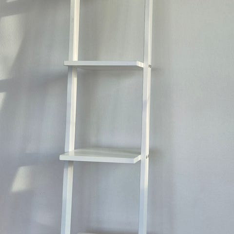 Rusta Jesper steghylla i vit färg. Hyllan har flera öppna hyllplan i stegform som lutar mot väggen. Passar för förvaring av böcker, dekorationer eller mindre föremål i till exempel vardagsrum, sovrum eller hall.