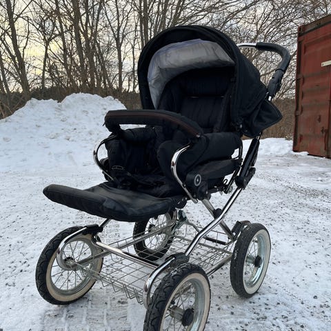 Barnvagn med både liggdel och sittdel i svart tyg. Vagnen har fyra hjul med svängbara framhjul och större bakhjul. Handtaget är ställbart och chassit är i metall. Liggdel och sittdel kan monteras på chassit vid behov. Passar för spädbarn i liggdel och större barn i sittdel. Sovdel och sittdel har sufflett och skyddande överdrag framtill.