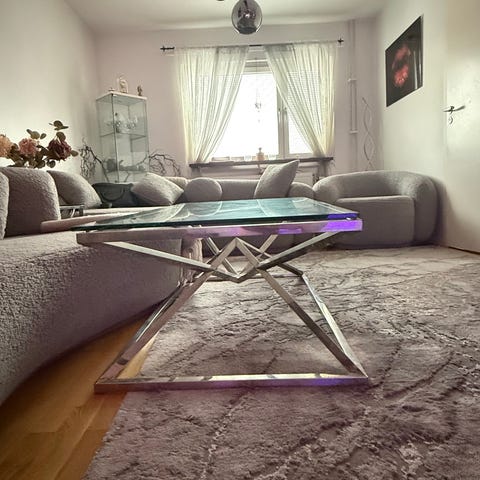 Säljer ett stilrent sidobord/soffbord med modern design. Bordet har en elegant spegelyta och en stabil metallram i kromfinish, vilket ger ett lyxigt och minimalistiskt intryck. Perfekt som avlastningsbord vid soffan eller som dekorativ möbel i vardagsrummet.