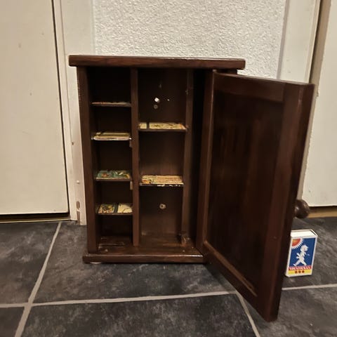 & Other Stories smyckesskrin i brun träimitation. Modellen har tre utdragbara lådor på vänster sida och ett skåp med glasdörr på höger sida. Invändigt finns spegel och krok för upphängning av smycken. Passar för förvaring av halsband, armband, ringar och andra mindre accessoarer på byrå eller hylla.höjd 22 cm bred 19 cm