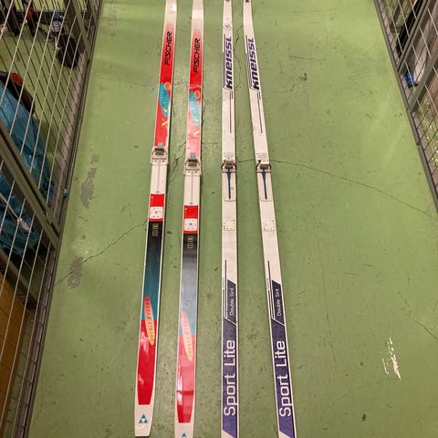 Fischer och Madshus längdskidor med Rottefella- och Salomon-bindningar. Skidorna är klassiska längdskidor och ett par är utrustade med skins-fäste. Bindningarna är av typen Rottefella och Salomon.
