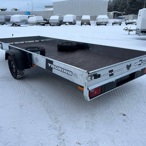 4P Touring 490TXI är ett stort och rejält släp med hela 185 cm flakbredd och inline hjulplacering. Skiglides och extra grepp för den skoter som ska backas upp. Fästen för superclamp skruvade i varmförzinkade förstärkningsbalkar under. Nya trummor, belägg och lager förra året hos Yamahacenter (Åkte med handbroms på) PRIS: 89.875kr ink moms / 71.900kr ex moms