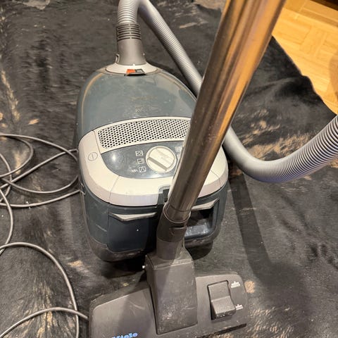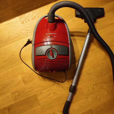 Nilfisk Compact dammsugare i röd färg. Klassisk golvdammsugare med slang, teleskoprör och munstycke för rengöring av golv och mattor. Passar för användning i hemmet för dammsugning av hårda golv, mattor och andra ytor. Drivs med el och använder dammsugarpåsar (påse syns på bilden).