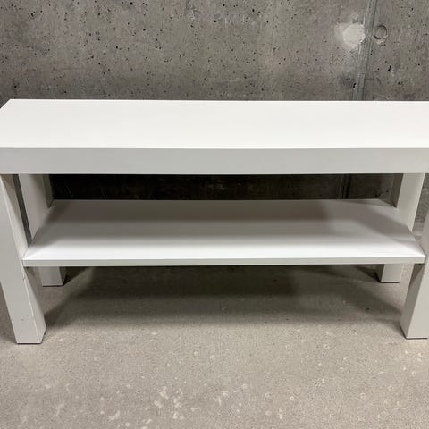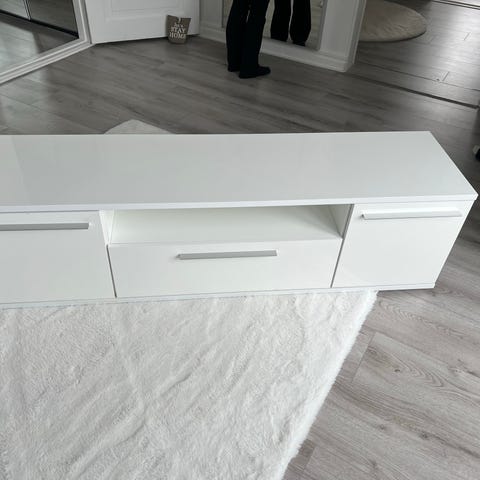 Tv bänk i vit pianolack. 2 breda lådor samt hål för kablar bak.