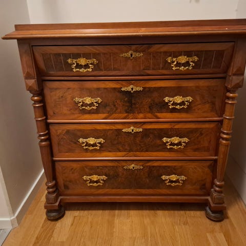 Hög byrå i trä med 5 lådor och en skåpsdörr. Byrån har dekorativa beslag i metall och profilerade detaljer på sidorna. Passar för förvaring av kläder, textilier eller andra mindre saker i sovrum, hall eller vardagsrum.