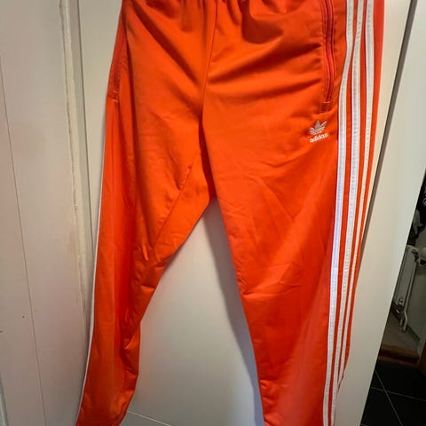 Adidas mjukisbyxor för herr i storlek S. Byxorna är svarta med vita sidoremsor och Adidas-logga på benet. Tillverkade i polyester med resår i midjan och dragsko för justerbar passform. Modellen har dragkedjefickor och dragkedjor vid bensluten. Passar för vardagsbruk och träning.