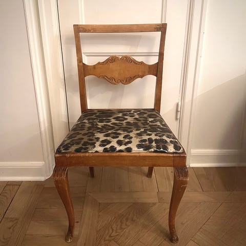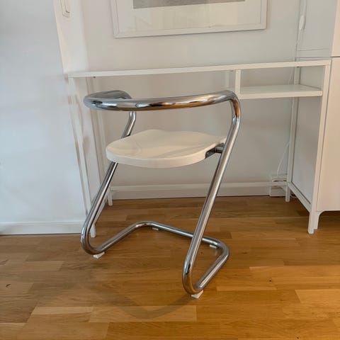 metallstomme och sits/rygg i trä. Perfekt som extra stol hemma, till skrivbord, barnrum, hobbyrum eller som inredningsdetalj.