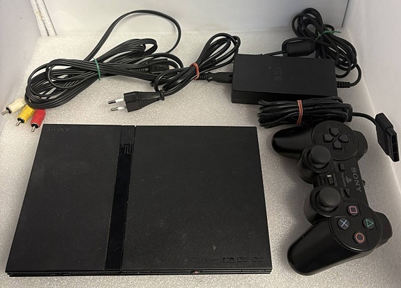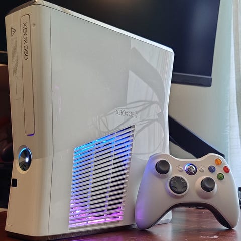 Xbox 360 S konsol med en handkontroll och strömadapter