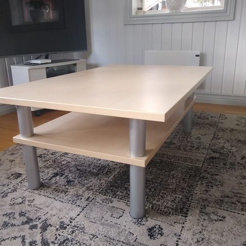 Vitt soffbord med kromade ben. Bordskivan är ommålad.