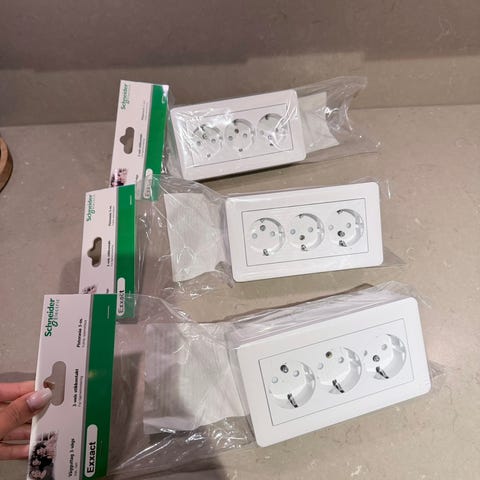 Schneider Electric komponenter från renovering (sannolikt modellen Exxact). Knappt använt, suttit uppe ca 6 månader och sedan varsamt demonterats (byttes mot annan modell pga utseende). Perfekt för renovering, tillbyggnad, garage, sommarstuga mm.