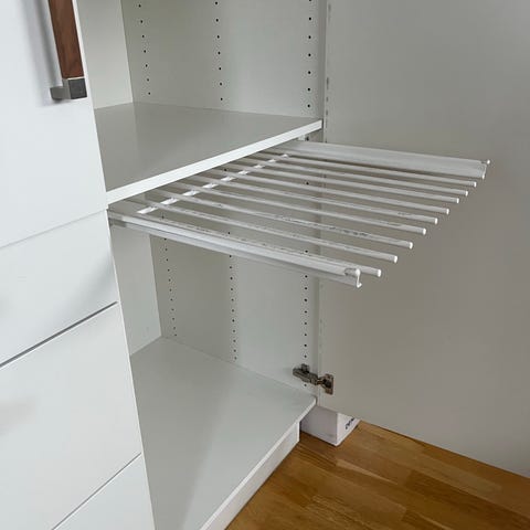 Utdragbar hängare för galgar och hylla längst upp och en hylla längst ner.