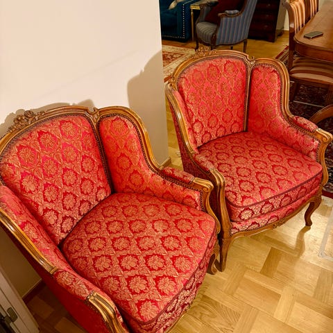 Två gamla fåtöljer med klädsel i sammet (nött på ett ställe, se bild). Vackra detaljer. Gott skick i förhållande till åldern. Bordets diameter är 75 cm och det är 52 cm högt.