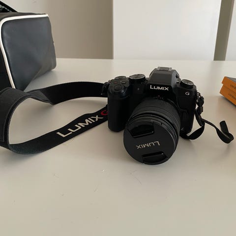 Det som ingår är kamerahus + optik, komplett i originallåda med nätdel/kabel (DMW-BTC14), stor ögonmussla och rem. Ett extra originalbatteri (DMW-BLJ31) medföljer också.
