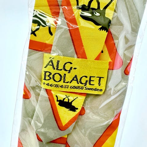 En samling slipsar med olika festliga och säsongsbetonade motiv. Motiven inkluderar en tupp, en kräfta, jultomten, en midsommarstång och älgvarningsskyltar. Fyra av slipsarna är från Stonehenge Collection och en är från Johen Company.
