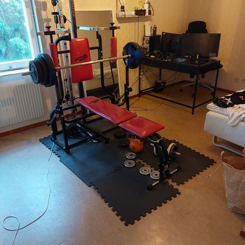 Ställning för skivstång med tillhörande träningsbänk och flera viktskivor i olika viktklasser. Utrustningen är avsedd för styrketräning, till exempel bänkpress, knäböj och andra övningar med skivstång. Ställningen har säkerhetsarmar och hållare för viktskivor på sidorna, vilket underlättar förvaring och byte av vikter. Passar för hemmagym eller mindre träningslokal där man vill ha en stabil lösning för träning med fria vikter.
