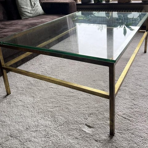 mässingsfärgad metall och två glasskivor. Ger ett luftigt och exklusivt intryck och passar perfekt i både modern och klassisk inredning.