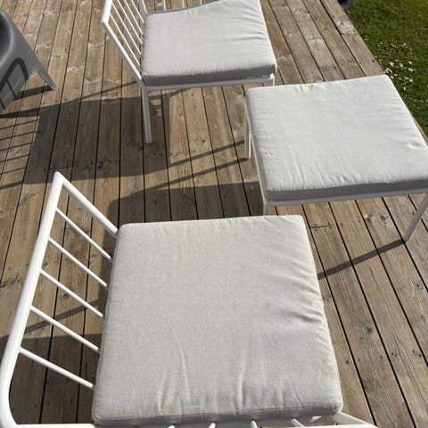 4 stycken trädgårdsstolar med dyna från Jysk. Stolen har metallstomme med ryggstöd i konstrotting. Mycket lätta och stapelbara. Säljes tillsammans för 1000kr