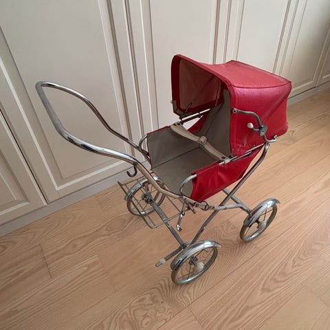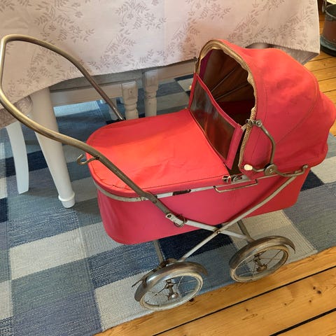 En charmig retro dockvagn i gul färg.