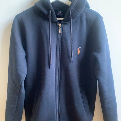 Zip- Hoodie mörkblå Liverpool FC med broderat klubbmärke på bröstet. Enligt tag storlek 10 bör vara XS.