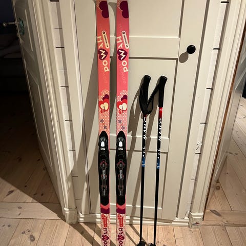 Rossignol Powah längdskidor 140 cm med matchande pjäxor. Pjäxorna är i storlek 33 och passar till skidornas bindningar. Stavarna är 100 cm långa.
