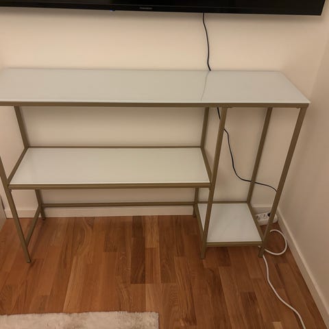 Säljer ett elegant och modernt avlastningsbord med vit skiva och guldfärgad metallram. Bordet har två praktiska hyllplan som ger bra förvaring för exempelvis dekorationer, böcker eller förvaring i hall, vardagsrum eller sovrum.