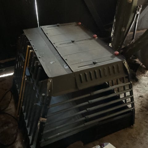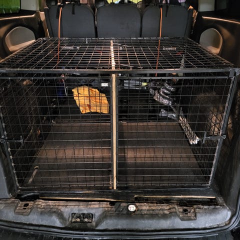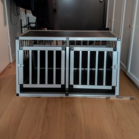 Dubbel hundbur i svart metall med gallerkonstruktion. Buren har två separata fack med varsin dörr framtill. Går att ta bort mittsektionen för att få 1 st stor bur.