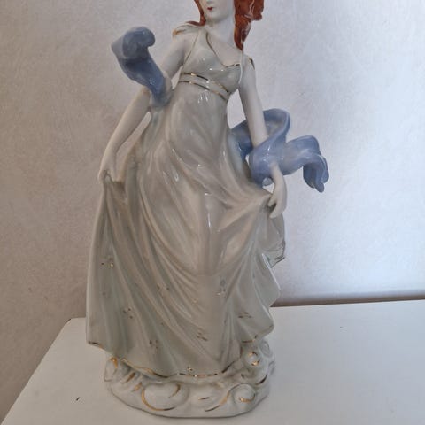 Vacker och elegant porslinsfigur från anrika Zsolnay, Pécs, Ungern. Handmålad med fina blå och gulddetaljer i klassisk Art Deco-stil.