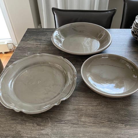 Handgjorda tallrikar från Gerbera, modell Provence. Grå keramik med vågig kant. Passar som mattallrikar och assietter. Varmgrå färgton som är lätt att kombinera med annat porslin.