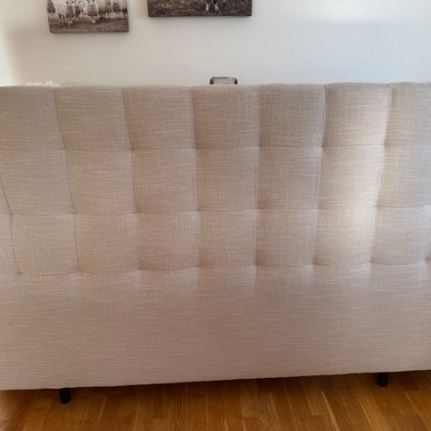Mio sänggavel i beige textilklädsel. Gaveln har en vadderad, knapptuftad framsida med rutmönster. Passar som huvudgavel till säng. 160 cm lång. Pris kan disskuteras vid snabb affär.