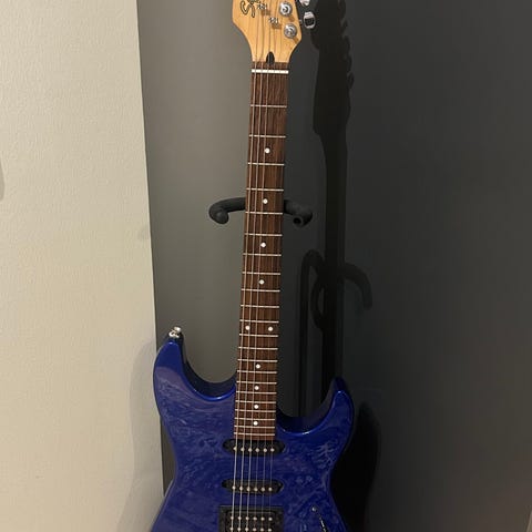 Elgitarr av märket Green i blå färg tillsammans med förstärkare. Gitarren har dubbla humbucker-mikrofoner, volym- och tonkontroller samt trelägesomkopplare. Kroppen är solid och instrumentet är utrustat med sv märket Fender och har stämskruvar i metall. Förstärkaren är en mindre modell som lämpar sig för övning i hemmet. Passar för elgitarrspel i olika musikstilar och kan användas både för övning och enklare inspelning eller spelning i mindre utrymmen. Sladd och ställ som är helt nytt ingår.