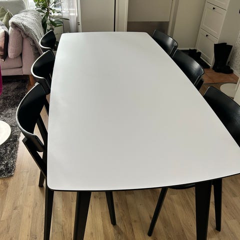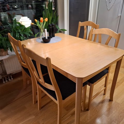 Inläggsskivorna skiljer sig något i färg jämfört med bordsskivan, då de aldrig har använts och har förvarats i ett mörkt förråd. Troligtvis jämnar färgskillnaden ut sig om de får stå i ljus under en period. Passar som matplats i kök eller vardagsrum för flera personer. Billigare vid snabb affär.