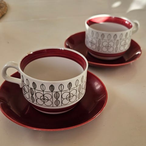 Kopp med fat i vit keramik med dekorativ kant i mörk och varm flerfärgad ton runt både koppens och fatets ytterkant. Passar för servering av kaffe, te eller andra varma drycker. Klassisk form med öra på koppen och matchande fat med upphöjd kant.
