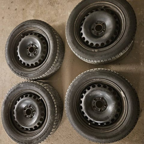 Dubbdäck 4st begagnade på 16 tums fälg för Ford Transit. Dimension 205/65X16 däck märke Marshall bult indelning 5X160 Däcket är monterat på fälgen och visas på bilden i utomhusmiljö.