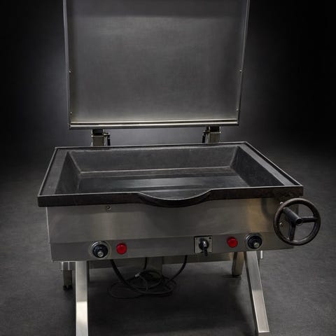 Rostfritt stekbord i metall för professionellt eller storkök. Utrustat med plan stekyta och flera vred på fronten för temperaturreglering av olika zoner. Stekbordet har en uppfällbar överdel på ena sidan som kan användas för pressning eller varmhållning av livsmedel. Enheten är avsedd att placeras på bänk eller arbetsbord och anslutas enligt gällande installationskrav för restaurangutrustning.