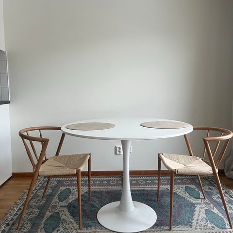 Runt matbord (105cm diameter) med målade blå ben (72,5cm från golv till bordsytan). Kan monteras ned, delas på mitten och går att ta av benen. Trälaminat tror jag.