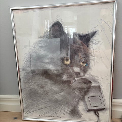 Lasse Åberg tavla med silverram och glas. OBS! Glaset har spruckit på två ställen så behöver ersättas, därav priset.