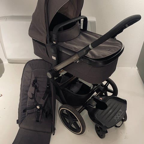 På bilderna syns även en matchande grå åkpåse från Bugaboo som passar i sittdelen. Passar för två barn i olika åldrar eller tvillingar, beroende på hur delarna monteras.
