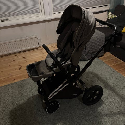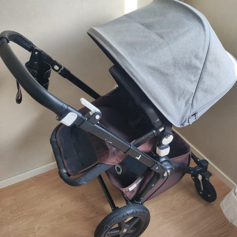 Bugaboo syskonvagn eller mono i grått tyg med svart chassi.