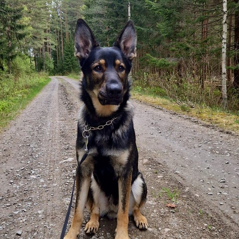 Detta är en tuff och väldigt stor schäferhane som gärna gränser, speciellt med nya förare.