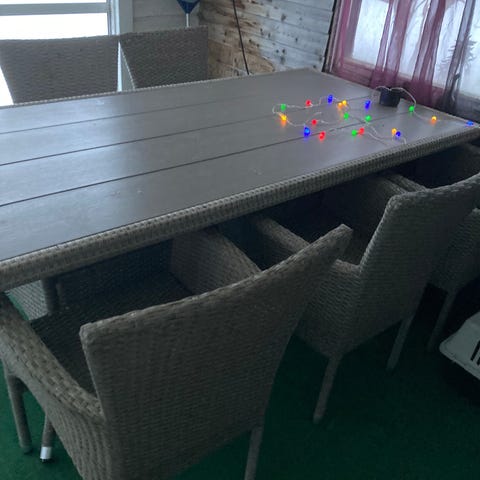 Möblerna är stabila och i bra begagnat skick. Bordet med glasskiva är lätt att torka av och stolarna är sköna att sitta i. Perfekt för morgonkaffet eller sommarkvällar med vänner.