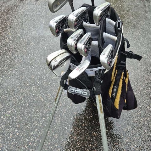 TaylorMade golfklubbor med bag. Setet inkluderar raw milled wedgear 54/58 och en driver från TaylorMade m5, samt en golfbag i vit och blå färg med flera fack för klubbor och tillbehör. Bagen har bärhandtag och flera ytterfickor.